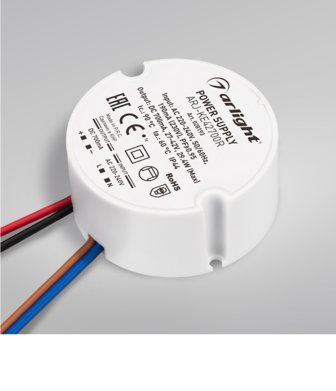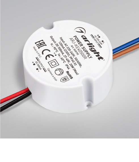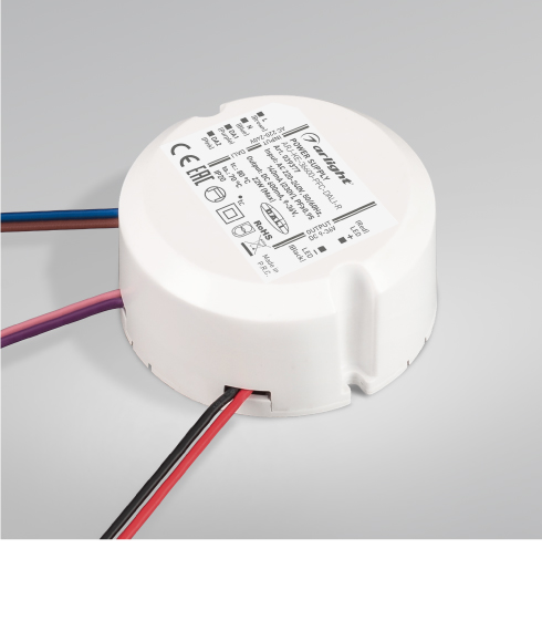 Источники питания ARJ-ROUND в круглом пластиковом корпусе предназначены для питания светодиодов, светодиодных светильников и других устройств, имеющих питание фиксированным током.