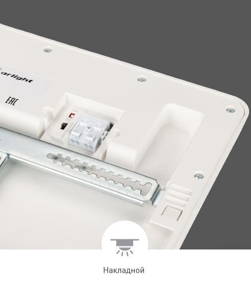 Светильники могут устанавливаться двумя способами: накладным при помощи монтажной планки и встраиваемым в нишу с помощью пружин. Монтажная планка для накладной установки поставляется в комплекте. Дополнительно можно приобрести набор для встраиваемого монтажа, в который входят два держателя и винты.