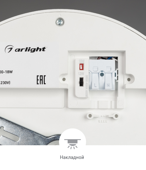 Изменяемые значения цветовой температуры (3000/4000/6000 К) и мощности (8/12/18 Вт). Значения переключаются на корпусе и устанавливаются по умолчанию при монтаже светильника.