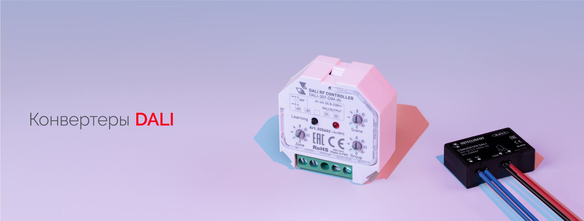 Разные протоколы В серии доступны устройства, преобразующие команды DALI в сигнал 0/1–10 В или DMX512, а также устройствами с сухими контактами на входе для подключения выключателей или датчиков.