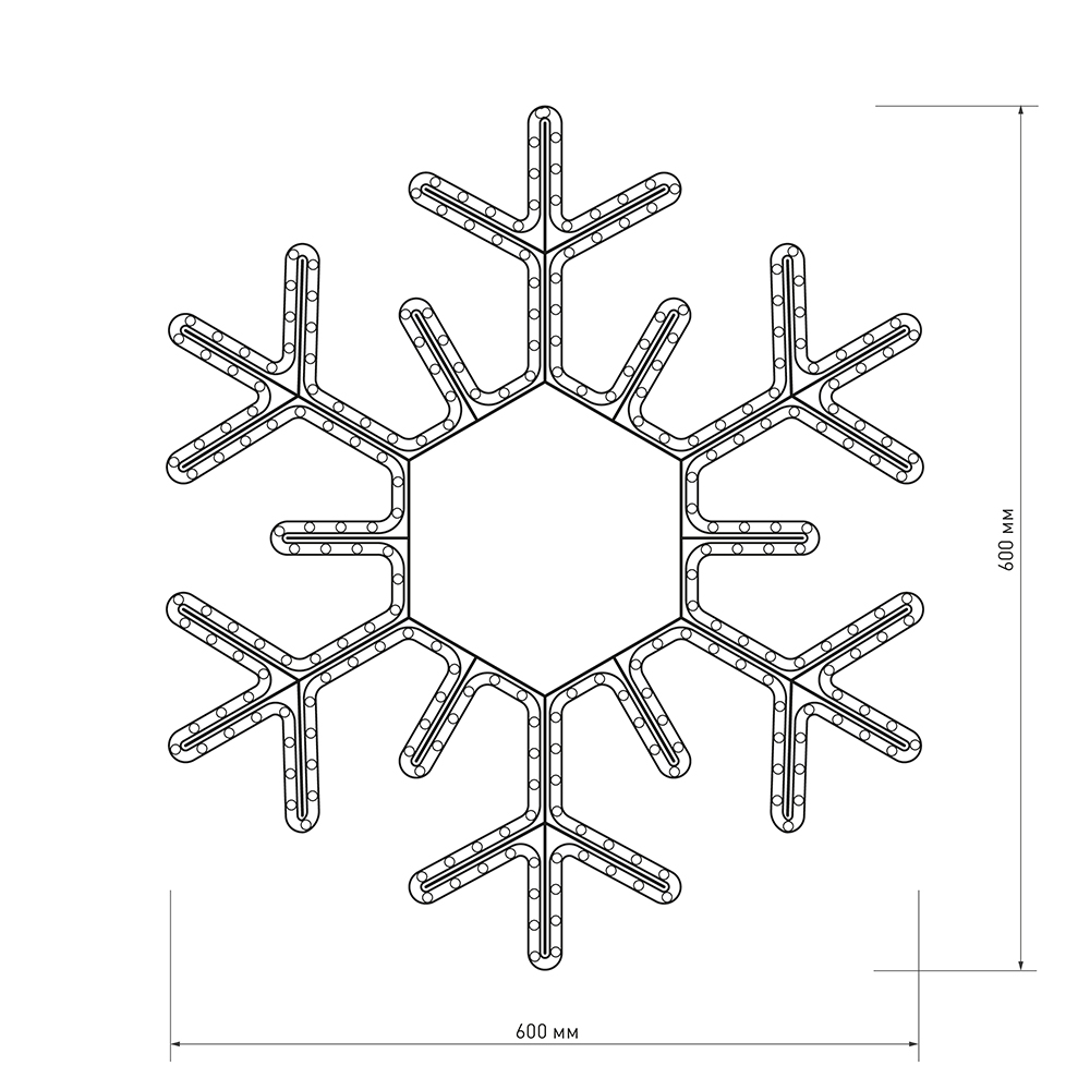 Светодиодная фигура СНЕЖИНКА. Размер 600x600 мм. Цвет светодиодов БЕЛЫЙ (6000 К), постоянное свечение. 216 светодиодов. Напряжение питания 230 В, потребляемая мощность 15 Вт, степень пылевлагозащиты IP65. Фигура укомплектована проводом питания для подключения к сети 230 В (без вилки питания).