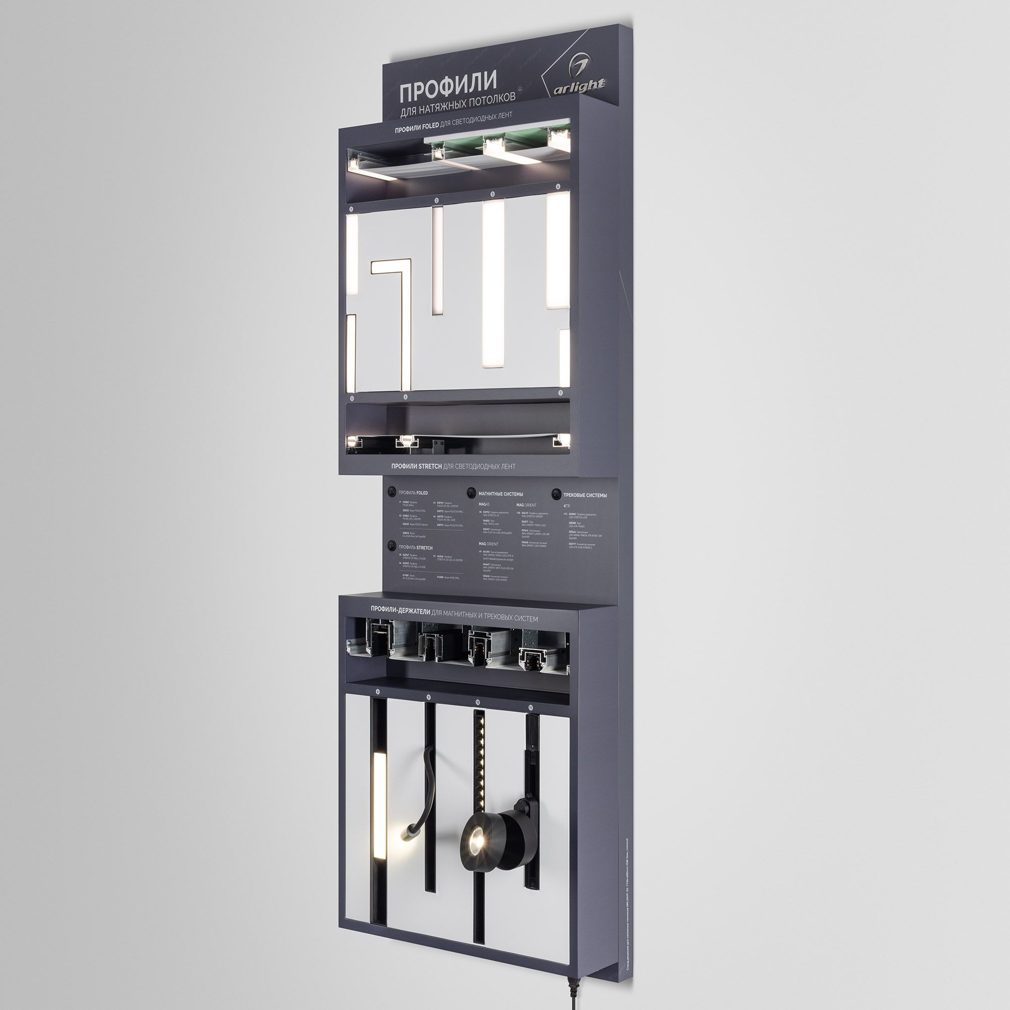 На стенде представлен ассортимент профилей Arlight для натяжных потолков: