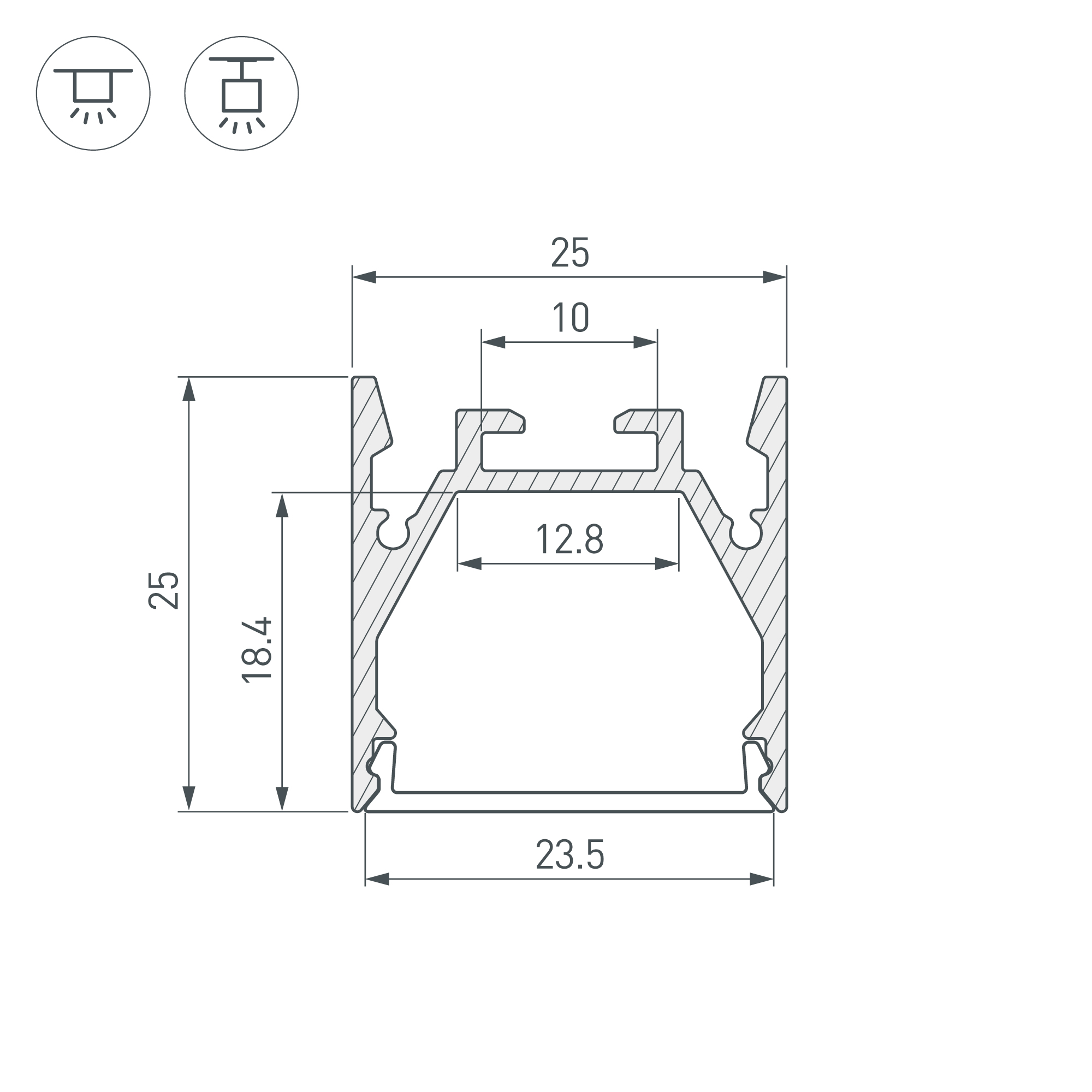 Габаритные размеры профиля составляют 2000 мм в длину, 25 мм в ширину и 25 мм в высоту. Площадка для установки светодиодных лент позволяет использовать ленту шириной до 12,8 мм и мощностью до 26,3 Вт/м. Это обеспечивает гибкость в выборе светодиодных лент и создает потрясающие световые решения.