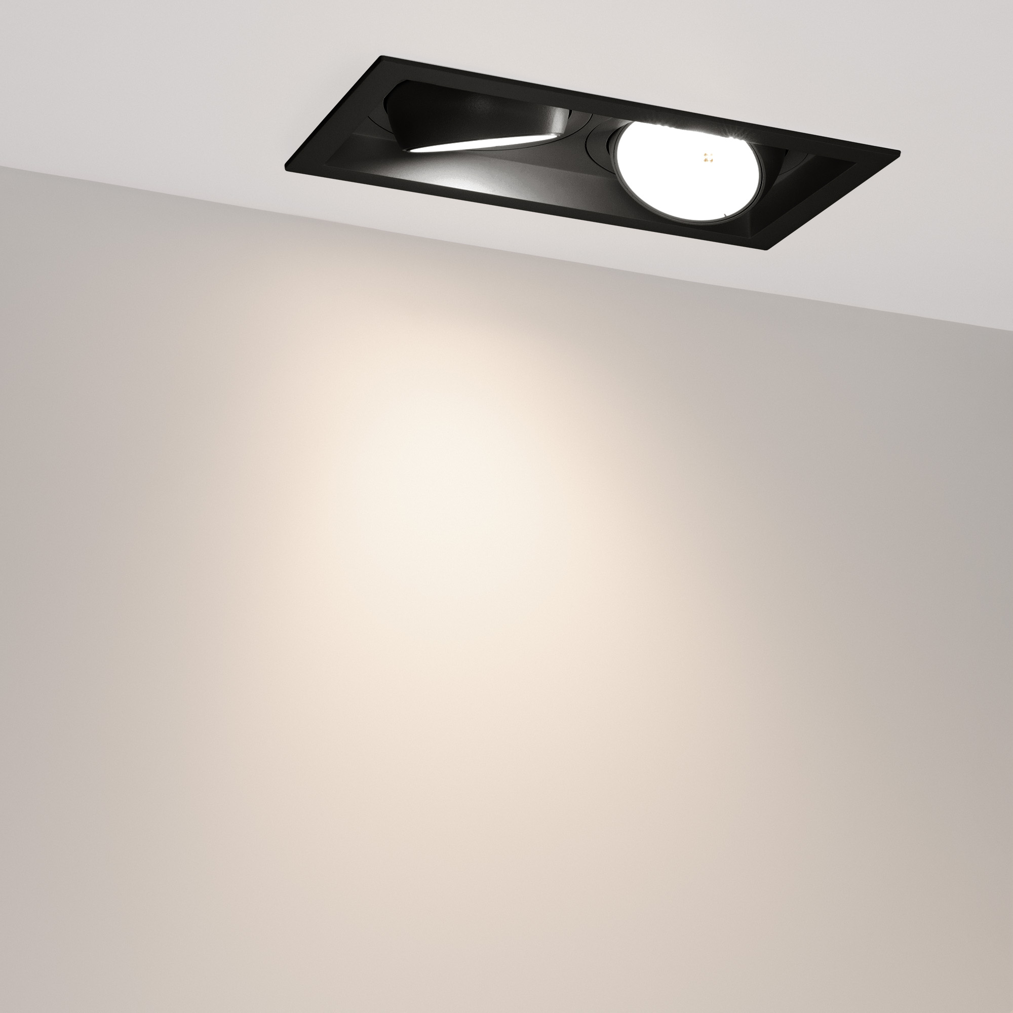Поставка под заказ от 24 шт. Встраиваемый карданный светильник. Мощность 2х30 Вт, св. поток 5300 лм, 88 лм/Вт, дневной 4000 K, CRI>92, угол 50°, напряжение питания 230 В. Чёрный корпус из алюминия, черная вставка, степень защиты IP20. Размер: длина 250 мм, ширина 140 мм, высота 125 мм. Монтаж встраиваемый, установочное отверстие: длина 230 мм, ширина 120 мм. Драйвер 24-42 В, 750 мА, пульсация <2%.