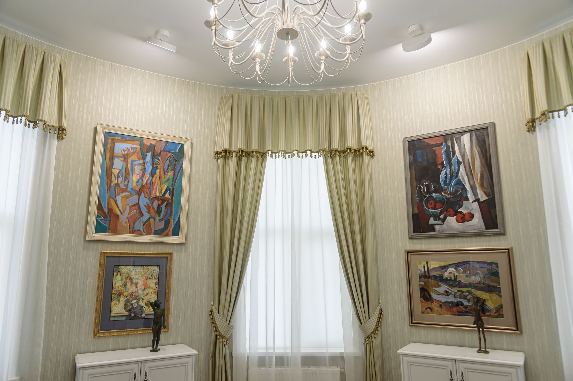 Особенностью проекта является многофункциональность: в рамках единого пространства было необходимо создать комфортную и удобную световую среду для проведения любых мероприятий, презентаций и выставок. Дизайнерская задумка реализована с помощью трековых светильников с регулируемым углом излучения. Основная потолочная подсветка создана с помощью светодиодных панелей с изменяемой цветовой температурой. В выставочных помещениях важна быстрая смена световых акцентов, поэтому трековые светильники, которые свободно перемещаются вдоль шины — идеальное решение. Для подсветки внешних оконных витрин используются накладные прожекторы, создающие оригинальную декоративную подсветку картин.
