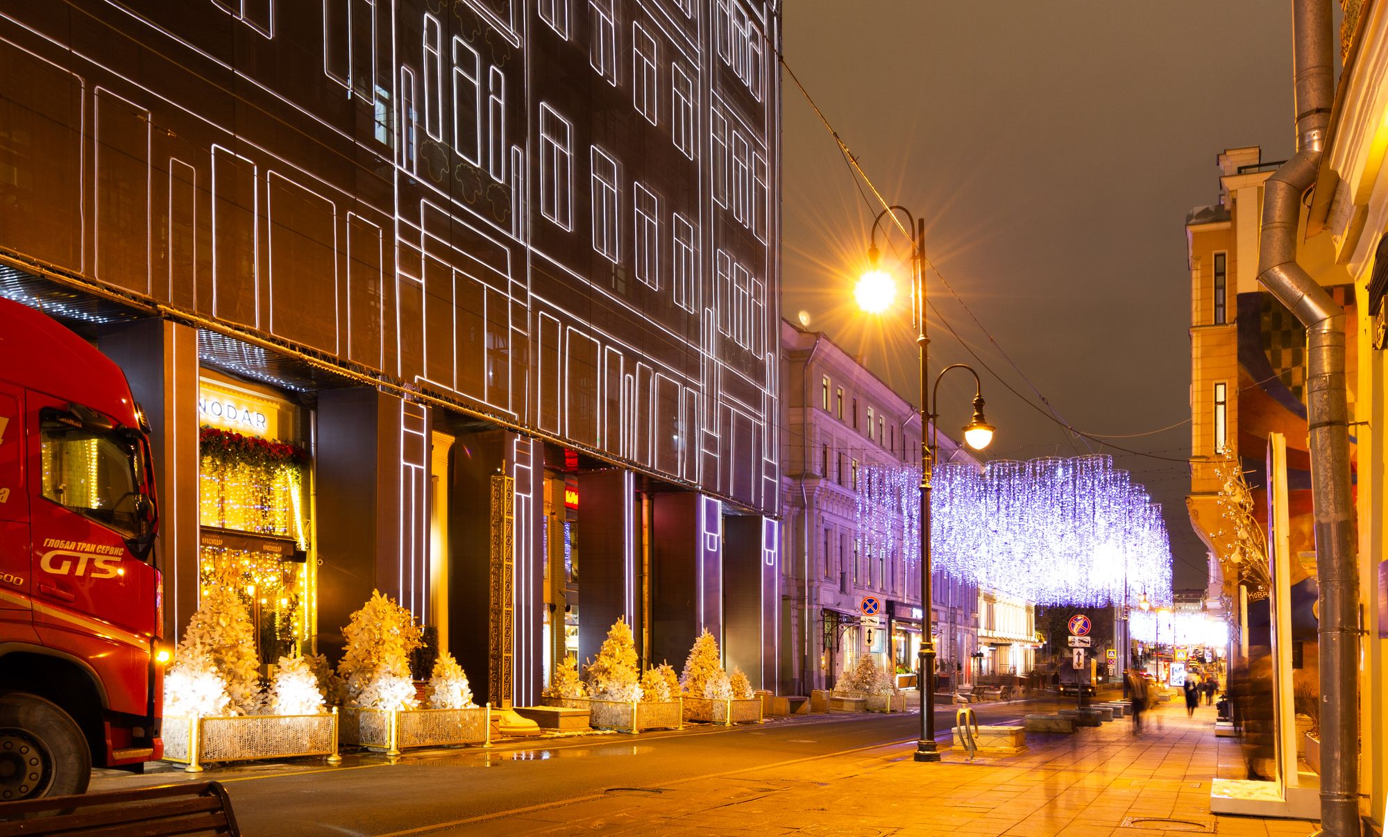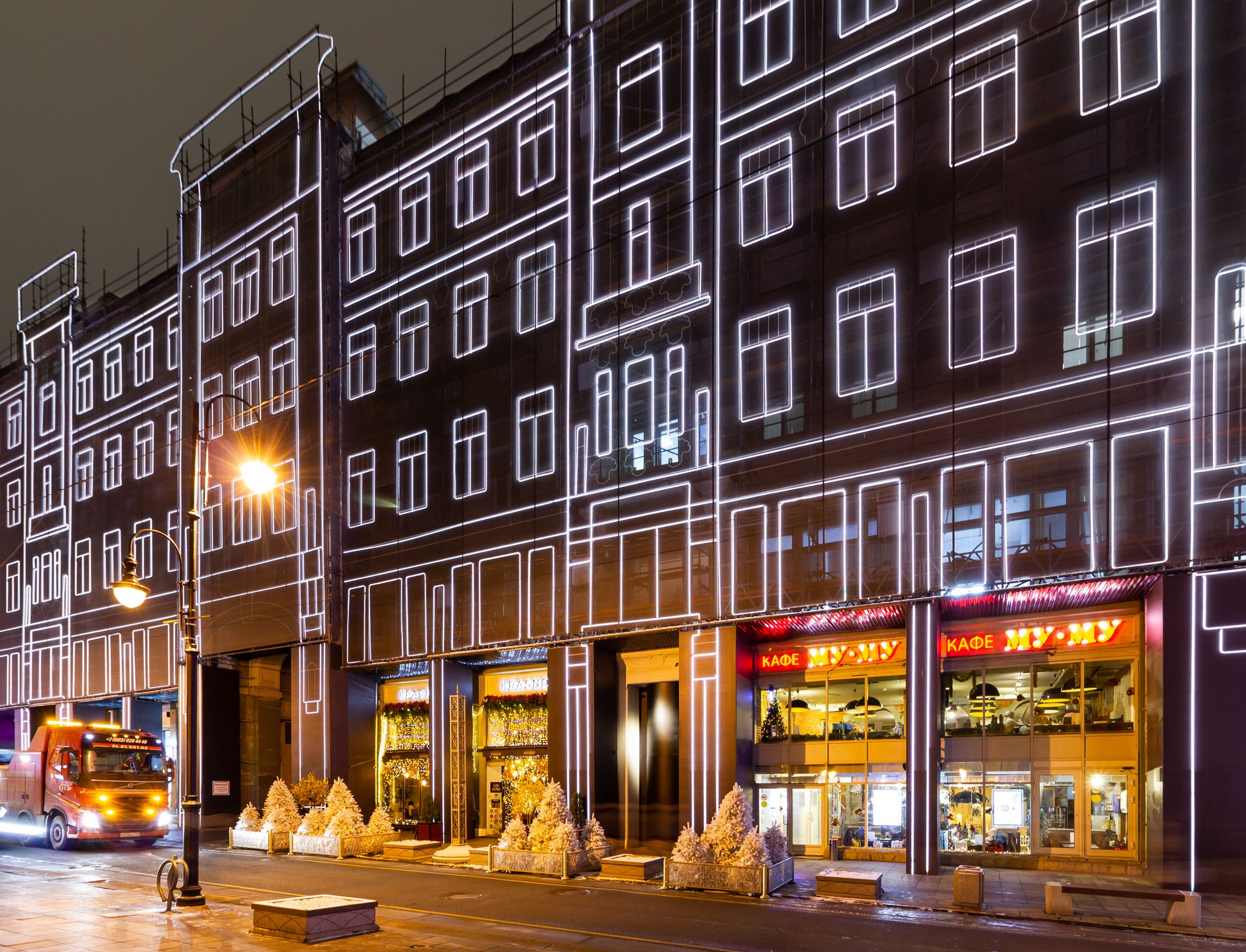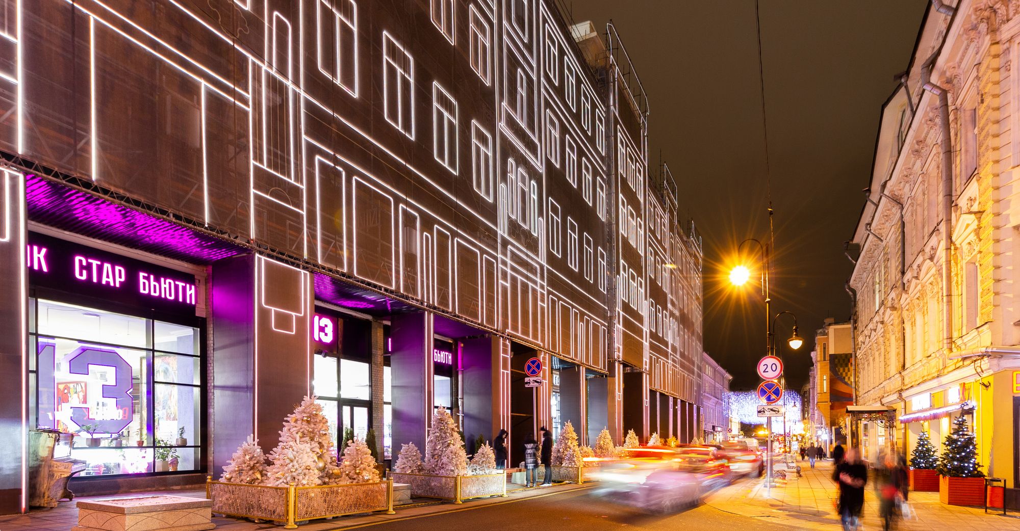 При создании эффектной фасадной подсветки премиального жилого комплекса «Большая Дмитровка IX» было использовано интересное техническое решение. Гибкий неон закреплен на внешней стороне строительной сетки, что позволило проводить отделочные работы и в то же время сделать законченную декоративную подсветку. Возможность изменения цвета RGB-неона с помощью контроллера дает возможность менять световой облик здания. За счет высокой степени пылевлагозащиты IP65 гибкий неон можно эксплуатировать при любых погодных условиях."